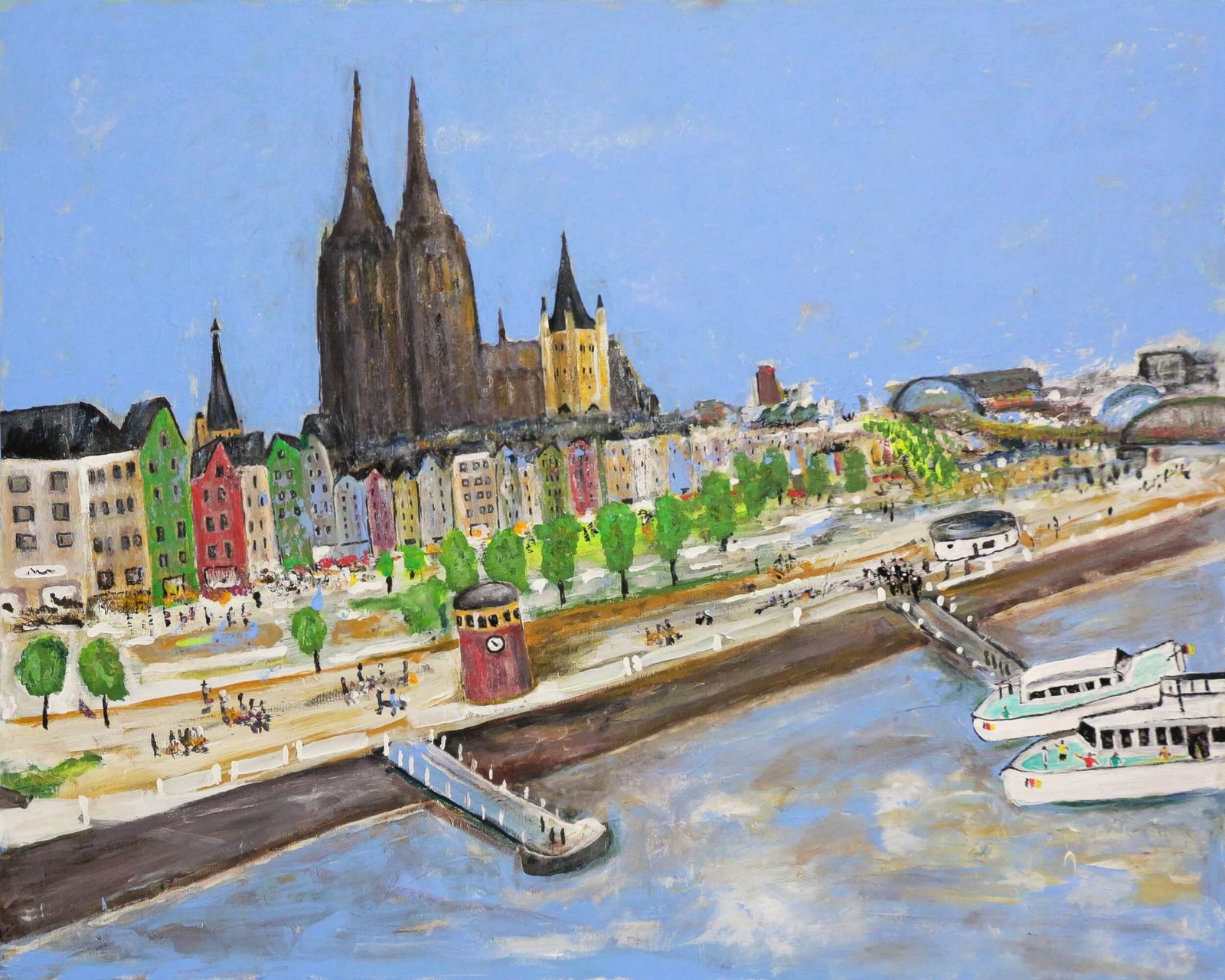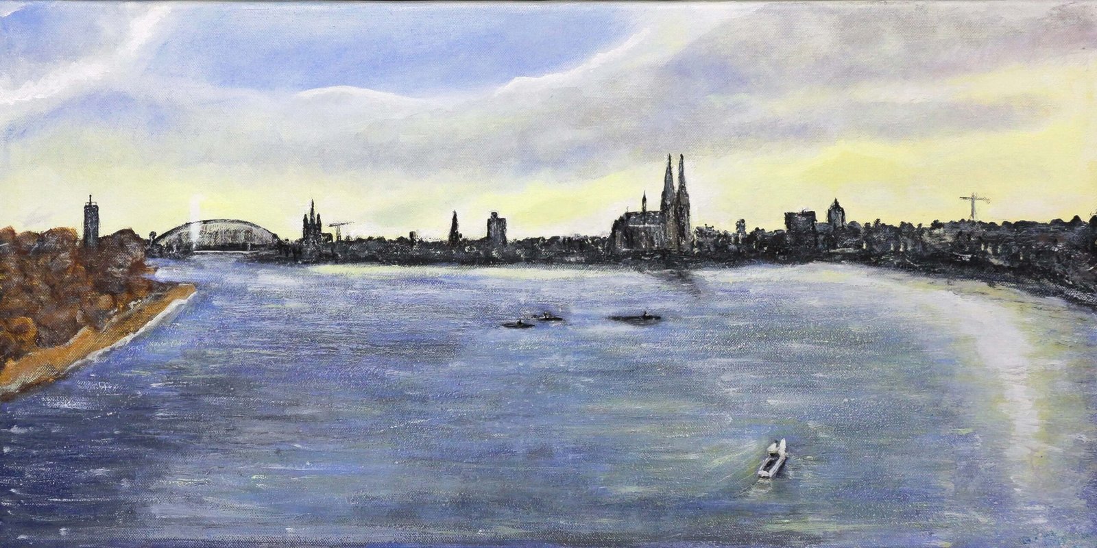 Die Silhouette ist dabei kein statisches Motiv. Sie verschiebt sich, bricht auf, wird aus verschiedenen Blickwinkeln neu gesehen: vom Rheinufer her, von der Höhe des Doms, aus der Perspektive der Altstadt. Der Dom kann einmal monumental erscheinen, ein anderes Mal in den Hintergrund treten, während St. Martin oder die Lichter am Fluss die Komposition prägen. Perspektive und Licht verwandeln die Stadt beständig – sie erscheint nie gleich, sondern in stetiger Bewegung, als vibrierendes Geflecht von Geschichte und Gegenwart.