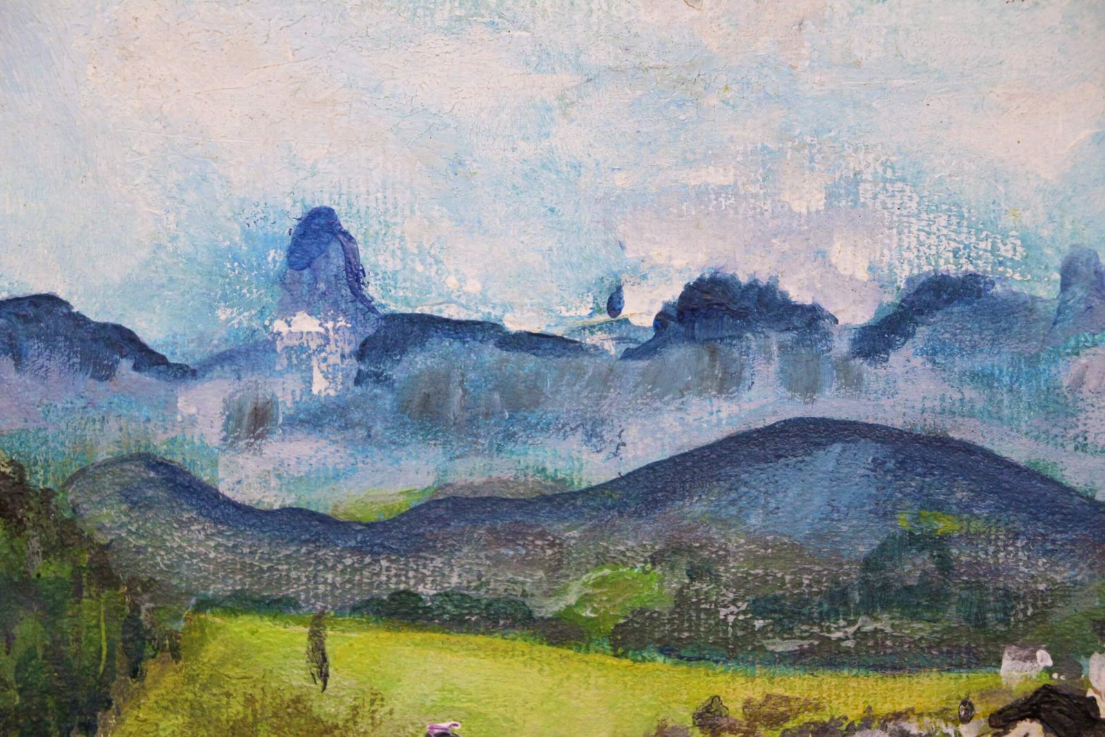 Das Figürliche seiner Landschaften liegt nicht in der anthropomorphen Deutung, sondern in der Relation zwischen Mensch und Welt. Oft tritt der Mensch nur als winzige Figur am Rande des Bildes auf, kaum erkennbar, fast verschwindend im Übermaß der Natur. Diese Verhältnisse verweisen auf eine existentielle Erfahrung: Wir sind klein im Angesicht der Landschaft, Fragmente in einer Ordnung, die uns übersteigt.